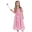 Rosa Prinzessinnenkostüm mit durchsichtigen Puffärmeln. Das Kleid ist mit einem glitzernden Tüllstoff überzogen, der mit Schmucksteinen und Zierblüten besetzt ist.